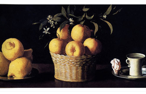 Forse la piu’ antica raffigurazione di una tazzina ricolma della calda bevanda e’ la straordinaria natura morta di Francisco de Zurbaran, Piatto di cedri, cesto di arance e tazza con rosa (1633, Los Angeles, Norton Simon Foundation), l’unica firmata dall’artista, capolavoro autentico di natura morta.
